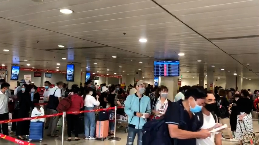 Hàng dài người chờ xếp hàng làm thủ tục, soi chiếu an ninh ở sân bay Tân Sơn Nhất (TP.HCM) vẫn tiếp diễn trước đợt nghỉ lễ 30/4.