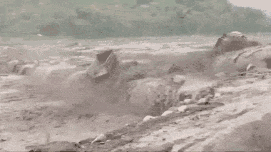 Hai chiếc xe tải cỡ lớn ở Lumajang, Indonesia bị lũ cuốn trôi gần 100m trước khi xe lật nhào.