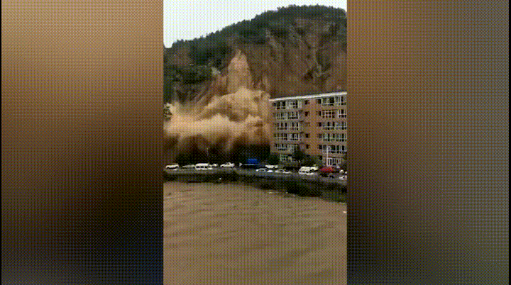 Người dân ghi lại khoảnh khắc một phần sườn núi sạt lở, đổ ụp xuống một con đường ở tỉnh Sơn Tây, Trung Quốc.
