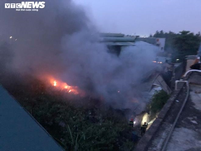 Khói lửa ngùn ngụt bốc lên từ vụ cháy vào lúc 17h30 ngày 14/7 tại xưởng sản xuất mũ bảo hiểm tại Hoài Đức, Hà Nội.