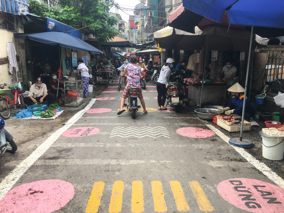 Chợ Tân Mai (Hà Nội) tiến hành vẽ ô, kẻ vạch, phân luồng giao thông để phòng, chống dịch COVID-19.
