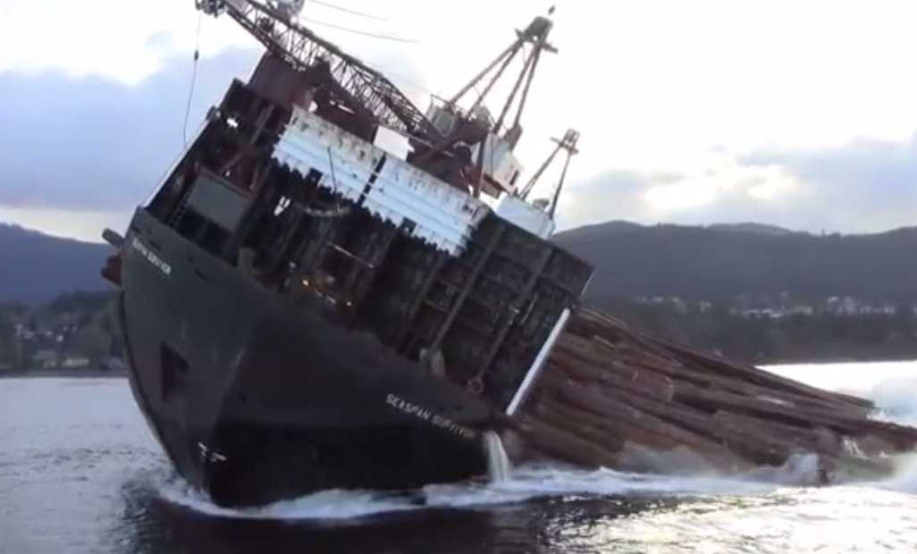 (VTC News) - Thoạt nhìn sẽ tưởng con tàu đang gặp nạn sắp chìm, nhưng không hề, đó là cách xuống hàng chưa từng thấy của một tàu vận tải gỗ ven biển ở Canada.