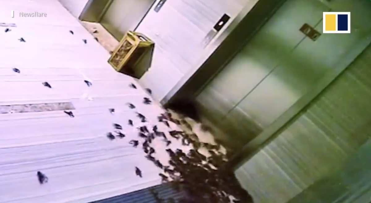 Đàn tôm ở lâu trong túi thoát ra khỏi đó và chạy khắp sảnh trước thang máy. Khi 2 nhân viên ở đây đến nơi làm việc, mở cửa thang máy và nhìn thấy cảnh tượng này, họ khá hốt hoảng. Thậm chí, hộ phải nhảy qua chúng để bước ra khỏi thang máy.