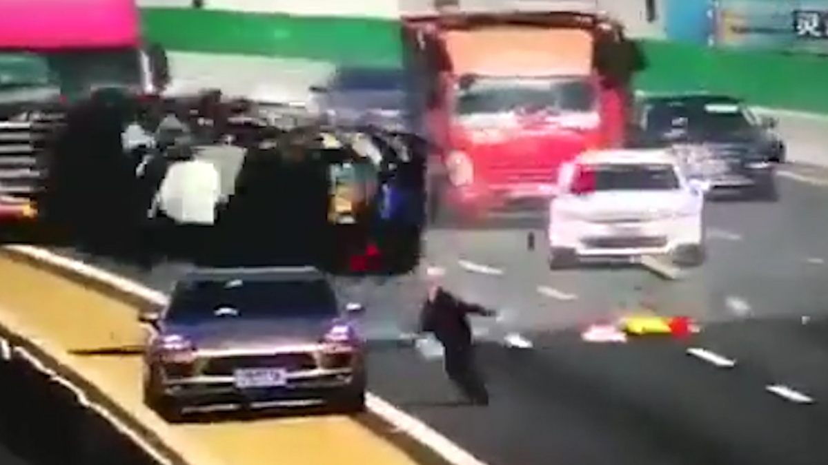 Xe tải vấp vật lạ giữa đường, mất lái lao sang đâm ôtô con cùng chiều, khiến xe này lộn nhiều vòng vòng, rồi rơi xuống cầu từ độ cao 20m tại Trung Quốc.