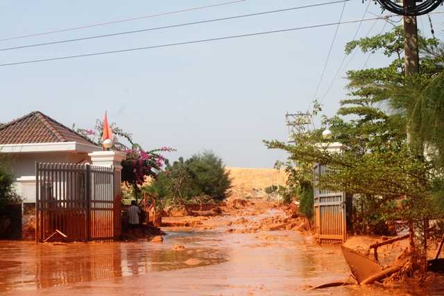 (VTC News) - Một moong khai thác titan ở Bình Thuận bị vỡ đẩy bùn đỏ đổ tràn ra đường.