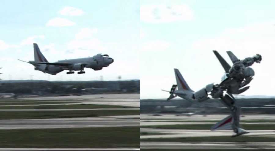 Chiếc Boeing 777 bất ngờ biến hình ngoạn mục thành một robot khổng lồ sau khi hạ cánh tại sân bay Frankfurt, Đức khiến người xem “mắt chữ A miệng chữ O”.