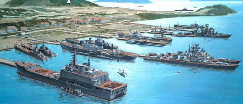 | Hình ảnh vẽ lại Cảng Cam Ranh khi còn có sự hiện diện của các tàu Hải quân Nga |