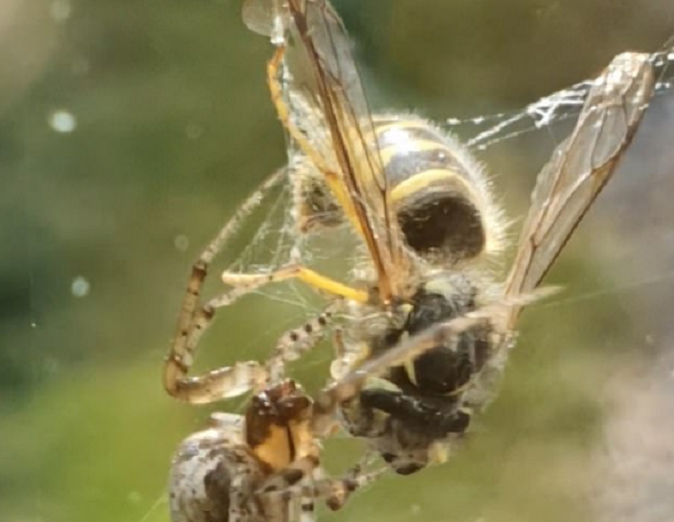 Trong đoạn phim được 3 mẹ con ghi lại, con ong bắp cày đang cố bám víu vào mạng nhện trong khi kẻ săn mồi đang cố gắng đoạt mạng nó.