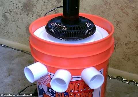 Sau đó quấn băng nhựa dẻo quanh ba lỗ hổng rồi đặt các ống nhựa PVC. Tiếp tục cắt một lỗ trên nắp thùng rồi đặt chiếc quạt máy lên trên. Có thể dùng quạt cỡ nhỏ cho tiết kiệm. Cuối cùng, bạn chỉ cần đổ đầy nước đá vào trong thùng là xong.