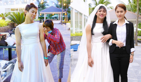 Chưa dừng lại ở đó, trong diễn biến cuối của clip, Khôi xuất hiện với hình ảnh của một “cô dâu” xinh đẹp, điệu đà sánh đôi cùng “chú rể” Diệu Hiền bảnh bao, lịch lãm. Khi dạo bước cùng nhau trên bãi biển, “cô dâu” không may bị ngã do vấp váy và khiến mọi người xung quanh bật cười sảng khoái.