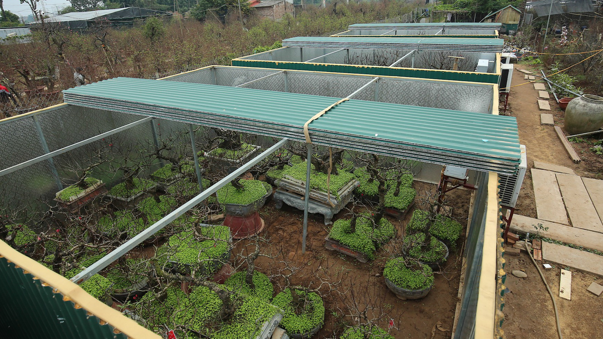 Nghệ nhân Lê Hàm ở Nhật Tân (Tây Hồ, Hà Nội) lắp máy điều hòa nhằm kiểm soát nhiệt độ để hoa đào Thất Thốn nở vào đúng dịp Tết Nguyên đán.