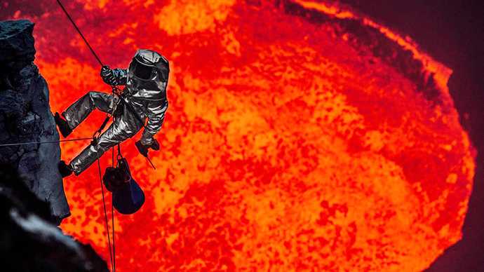 Video: Liều mình trèo xuống hồ dung nham nóng rực để quay phim