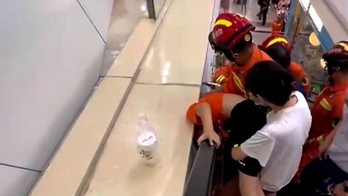 Lính cứu hỏa giải cứu thành công một cậu bé bị kẹt đầu giữa thang cuốn và bức tường tại TP Tín Dương (Hà Nam, Trung Quốc).