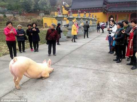 Điều trùng hợp là khi đó nhà chùa cũng đang có lễ tụng kinh. Chú lợn này đã quỳ hai chân trước hàng tiếng đồng hồ và 'chỉ chịu đứng lên sau khi các nhà sư quay về phía nó và tụng kinh'. theo tường thuật trên mạng tin Sina.