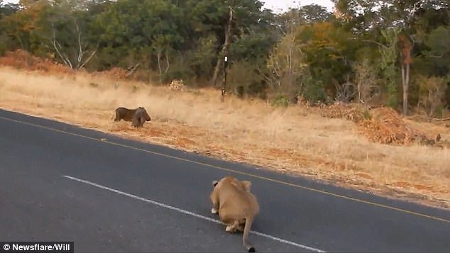 Trong đoạn video, con sư tử cái phục sẵn bên đường, chờ thời cơ lao tới xử lý con mồi là cặp đôi lợn rừng. Ngay khi đánh hơi thấy nguy hiểm, con lợn rừng đực tháo chạy thoát thân, bỏ mặc con cái vẫn vẫn đang mải ăn cỏ mà không hề hay biết sự tình.