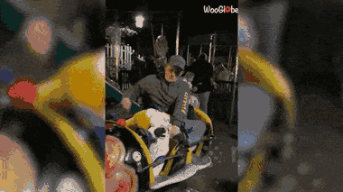 Người bố mắc kẹt trong ghế ngồi dành cho trẻ em tại một công viên giải trí, anh ấy vừa giữ lấy con gái vừa cố gắng tìm cách thoát khỏi chiếc ghế.