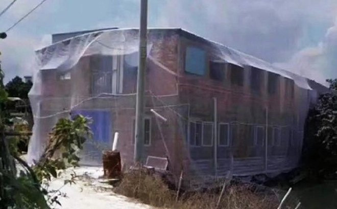 Nhà cạnh ao và cống, rất nhiều muỗi nên một gia đình ở Đài Loan đã mắc màn xung quanh ngôi nhà hai tầng của mình.