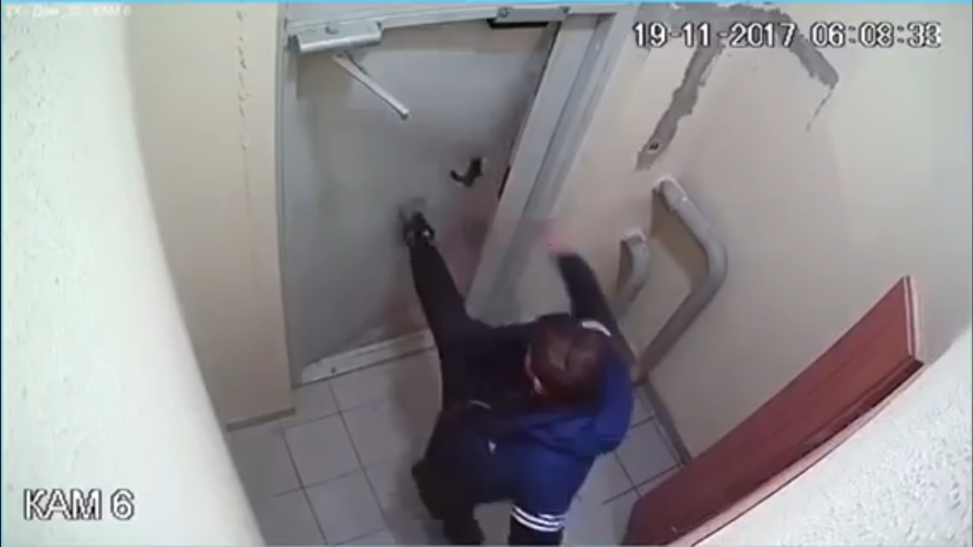 Đoạn video quay lại cảnh người đàn ông tại thành phố Balashikha thuộc vùng Matxcơva (Nga), sau đêm tiệc tùng linh đình bị mắc kẹt trong tòa nhà đến 3 tiếng đồng hồ.