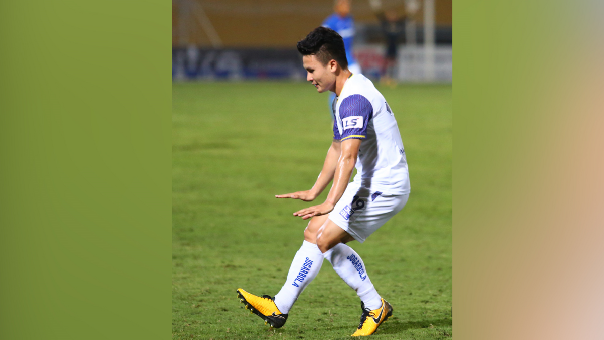 Tiền vệ Quang Hải có màn ăn mừng giàu cảm xúc sau khi ghi bàn nâng tỷ số lên 2-0 cho Hà Nội trong trận gặp Than Quảng Ninh.