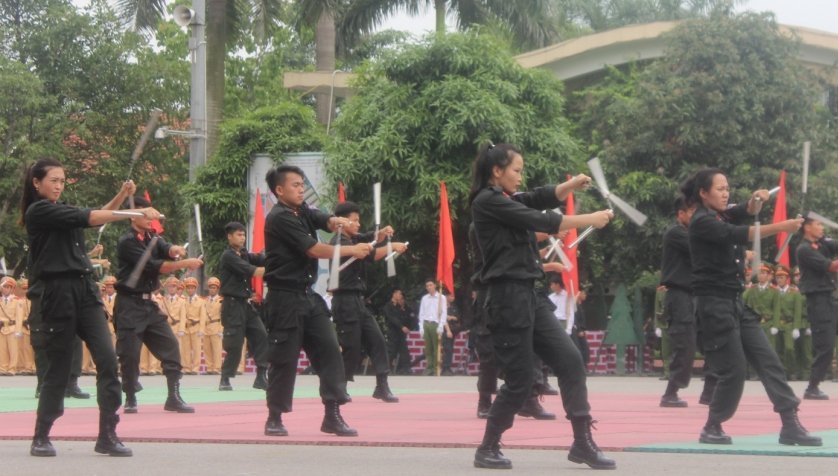 Màn biểu diễn múa côn nhị khúc bằng hai tay không chỉ có các bạn nam của Bộ Tư lệnh Cảnh sát cơ động K20 mà còn có sự xuất hiện của các bạn nữ.