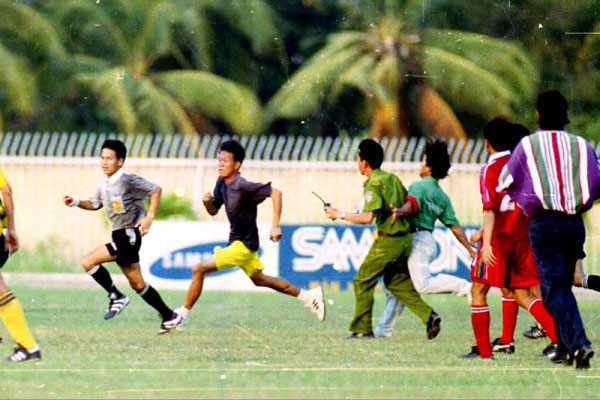 Rất may, trọng tài Trương Thế Toàn có những cú nước rút, và bước chạy zích zắc để thoát khỏi sự hung hãn của các cầu thủ chủ nhà.