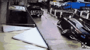 Một chiếc ô tô đang đậu bất ngờ mặt đường đổ sụp xuống kéo theo xe rơi xuống kênh ở TP Heyuan (Quảng Đông, Trung Quốc).