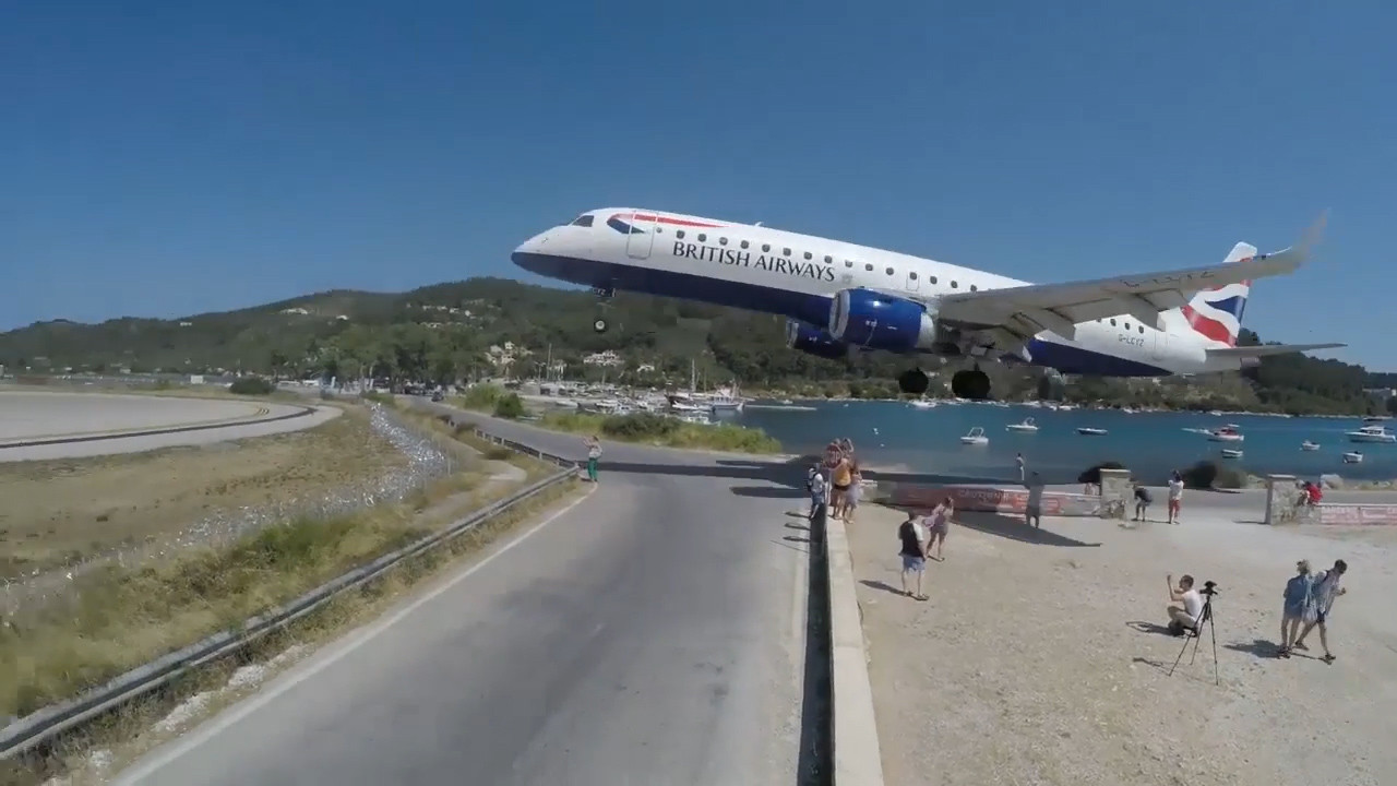 Chiếc máy bay của Anh hạ cánh ở độ cao tối thiểu trên đảo Hy Lạp, trong khi đám đông mải mê chụp ảnh bất chấp cảnh báo.