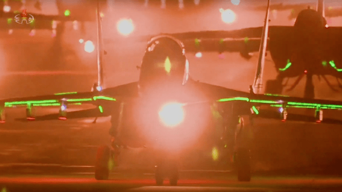 Đoạn phim cho thấy các máy bay phản lực MiG-29 Fulcrum và Su-25 Frogfoot của Không quân Triều Tiên. Có vẻ như để trở nên nổi bật hơn trong đêm, các máy bay này đã được trang bị dải đèn LED hai bên cánh.