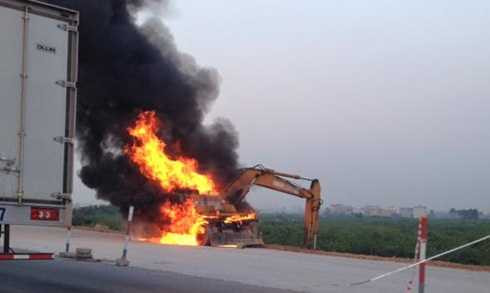 Khoảng 17h15 phút (24/8), tại khu vực thi công nút giao đường dẫn từ cầu Thanh Trì - QL5 mới, một chiếc máy xúc đang thi công bỗng bốc cháy dữ dội.
