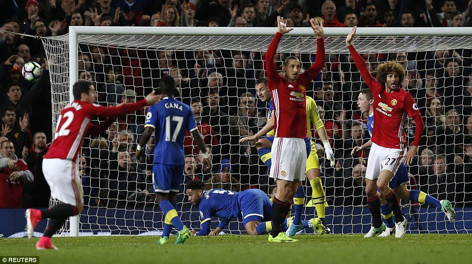 Phải đến phút 94, Luke Shaw có tình huống sút bóng khá hiểm hóc, buộc trung vệ Ashley Williams phải dùng tay chơi bóng và hành động này không qua mặt được trọng tài chính. Penalty cho MU và thẻ đỏ cho trung vệ của Everton.