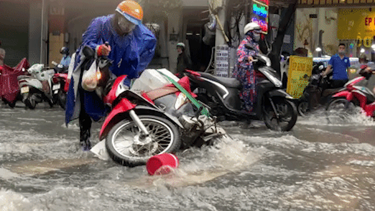 Chiều 19/5, mưa lớn khiến nhiều tuyến đường ở TP Thủ Đức ngập sâu, kéo dài, nước chảy xiết khiến nhiều người té ngã.