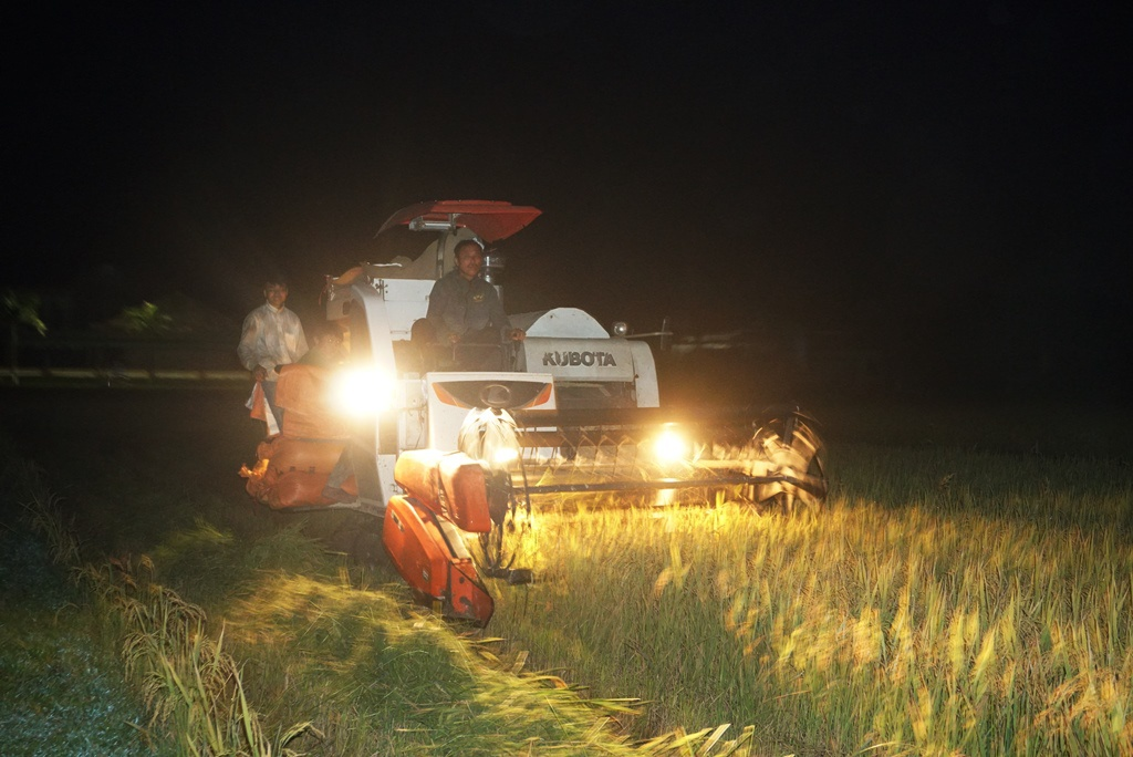 Để tránh cái nắng thiêu đốt da thịt vào ban ngày, người nông dân ngoại thành Hà Nội chọn cách ra đồng gặt lúa vào ban đêm.