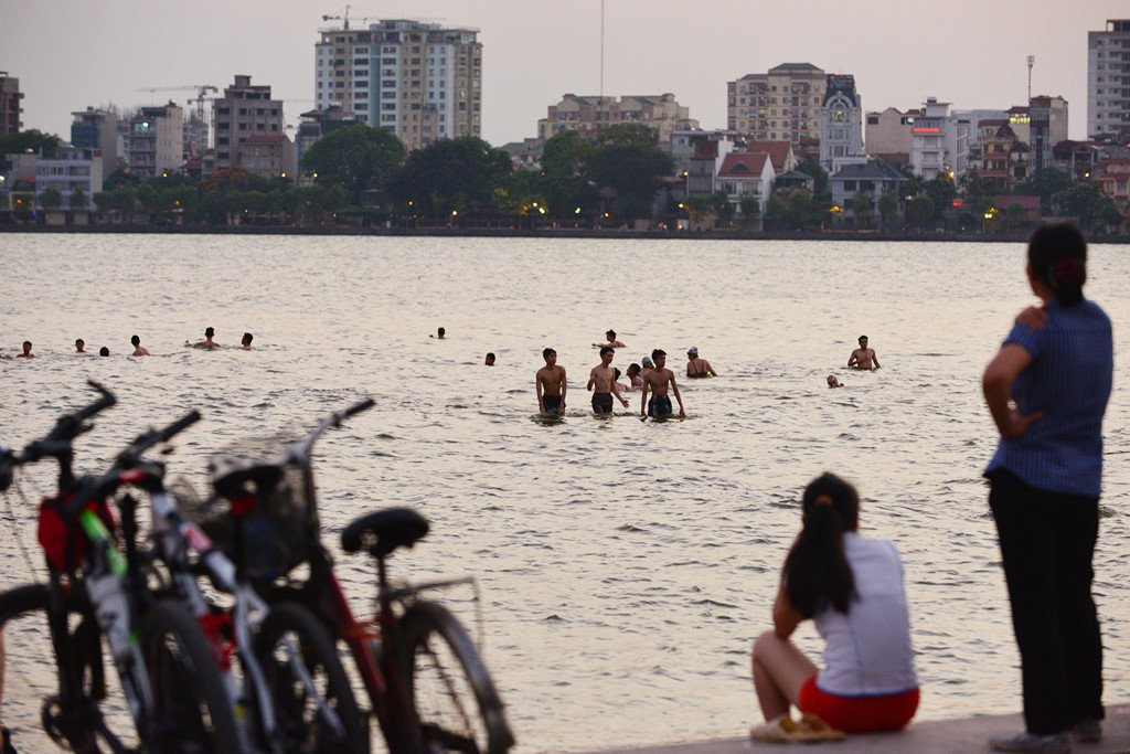 Dưới cái nắng như thiêu như đốt đầu hè, nhiều người Hà Nội đã tìm đến Hồ Tây (Quận Tây Hồ, Hà Nội) để tắm giải nhiệt.