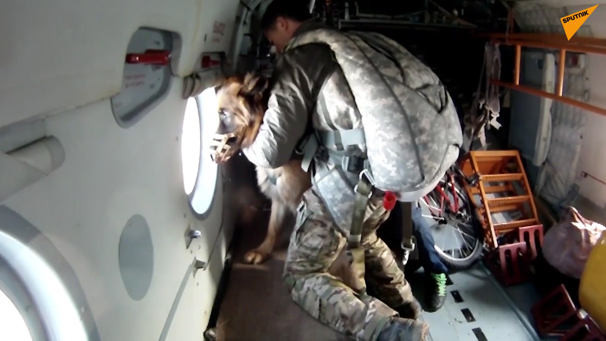 Công ty Technodinamika (Nga) thử nghiệm hệ thống nhảy dù dành cho chó nghiệp vụ, có thể mang chú chó nặng tới 45 kg từ độ cao 4.000 mét.
