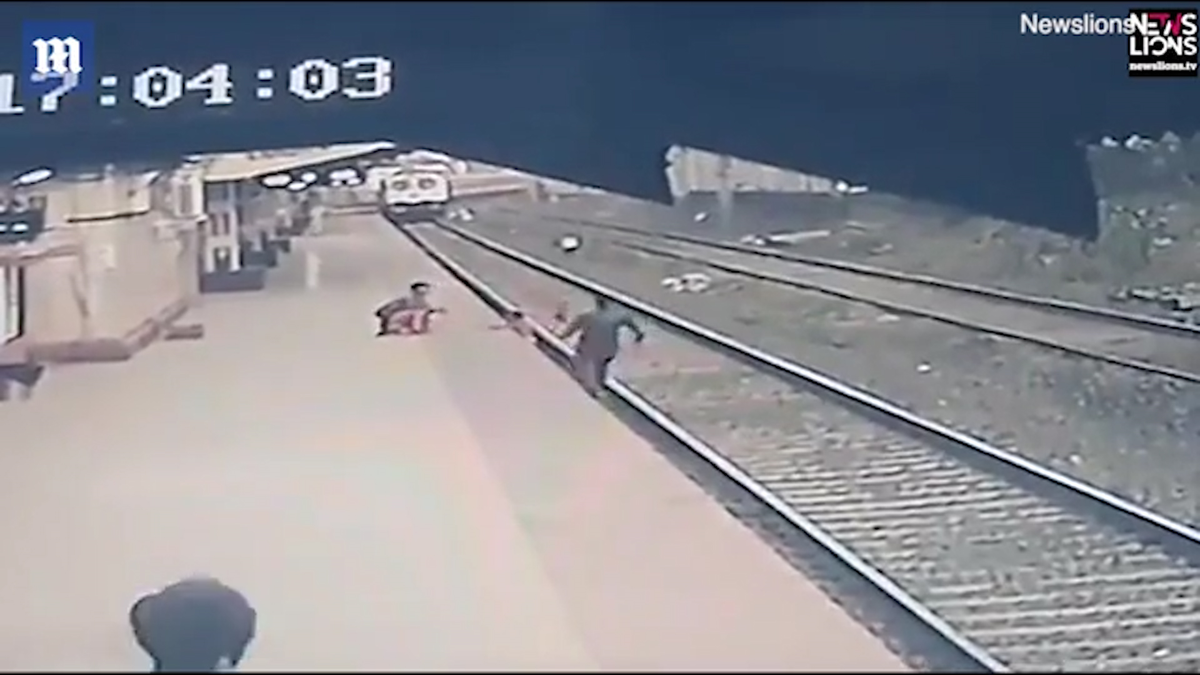 Bị ngã xuống đường ray, em bé kịp thời được nhân viên đường sắt được đưa lên vị trí an toàn khi tàu hoả đang chạy tới tại ga Vangani, Mumbai, Ấn Độ.