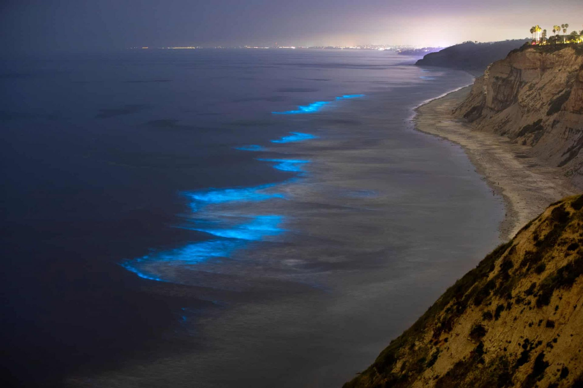 Những ngọn sóng phát sáng màu xanh lam xuất hiện ngoài khơi bờ biển phía Tây nước Mỹ do sự phát quang của một số loại sinh vật phù du trong nước.