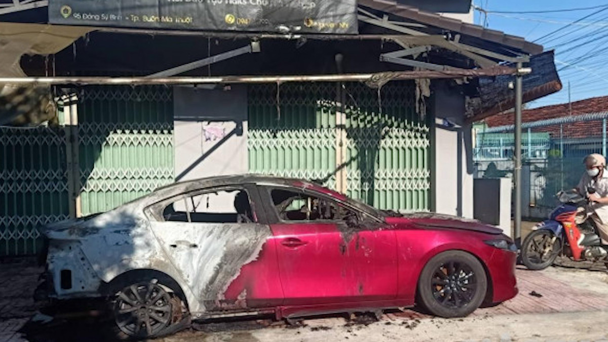 Chiếc ô tô Mazda 3 đỗ trước cửa nhà tại TP Buôn Ma Thuột, Đắk Lắk bất ngờ bốc cháy dữ dội trong đêm, chủ xe nghi ngờ có người phóng hỏa.