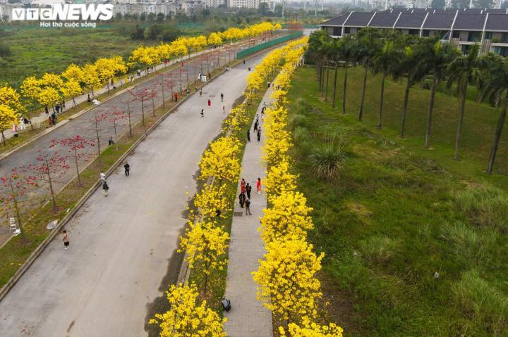 Hoa phong linh nở rộ phủ sắc vàng trên con đường dài gần 500m trong khu đô thị ParkCity (quận Hà Đông, Hà Nội) thu hút người dân đến đây tham quan, chụp ảnh.
