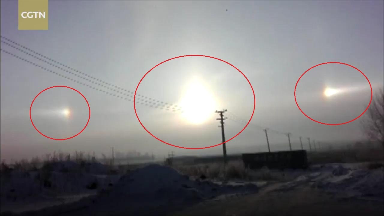 "Mặt trời ảo" hay "mặt trời giả" là hiện tượng ảo ảnh quang học hiếm gặp, xảy ra khi ánh sáng khúc xạ qua các tinh thể băng khiến mặt trời trông như có 3 phiên bản. Hiện tượng kỳ thú này được cho là báo hiệu mùa đông lạnh giá đang đến gần.