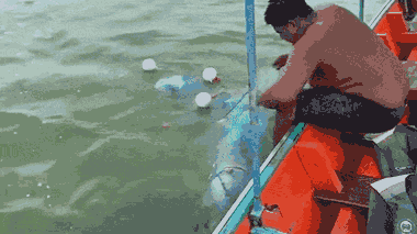 Một ngư dân tại tỉnh Nakhon Si Thammarat, Thái Lan phát hiện cá heo mắc kẹt đã dùng tay xé lưới giải cứu và đưa nó trở lại biển.