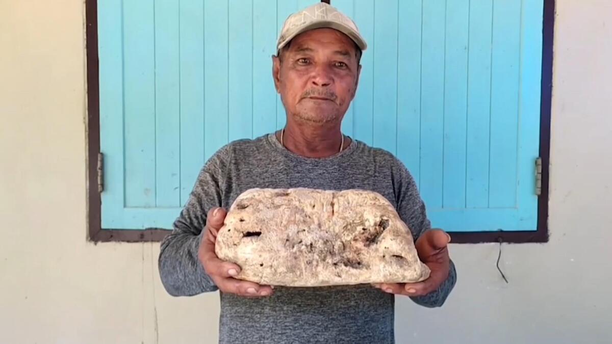 Một ngư dân tình cờ phát hiện khối long diên hương khổng lồ nặng 3,4 kg trôi dạt vào một bãi biển ở tỉnh Trat, Thái Lan.