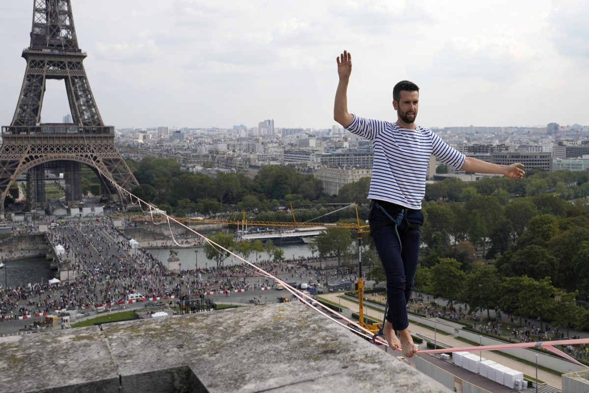 Một nghệ sĩ thăng bằng trên dây người Pháp chăng dây đi từ tháp Eiffel qua sông Seine ở độ cao 70m, trước sự cổ vũ của đám đông.