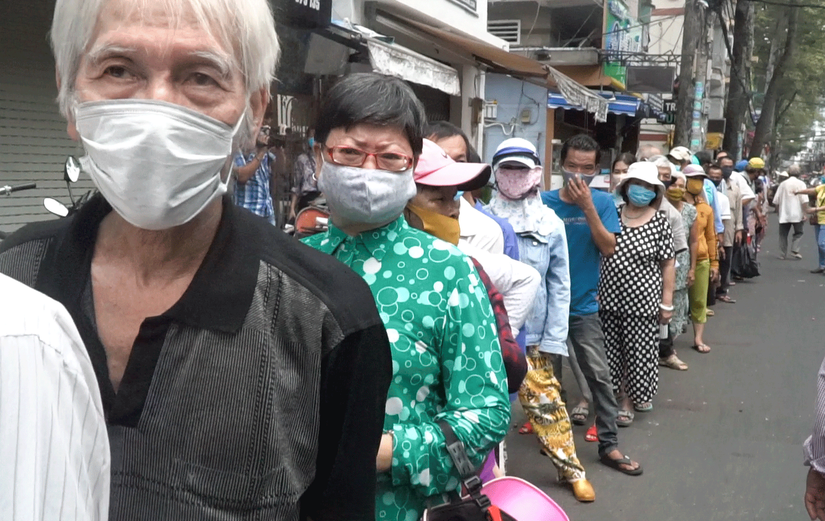 Trưa 2/4, hàng trăm người bán vé số, lao động nghèo… xếp hàng dài tại quán chay Bình An (quận 10, TP.HCM) để nhận cơm và mì miễn phí.