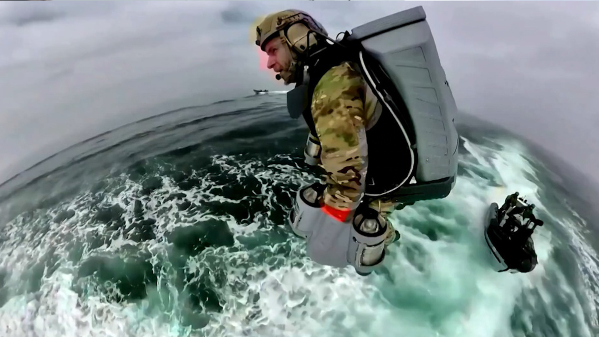Trong một cuộc huấn luyện, lính thủy đánh bộ Anh được trang bị bộ đồ bay đã vượt qua tàu cao tốc để đáp xuống tàu chiến nhanh chóng và chính xác.