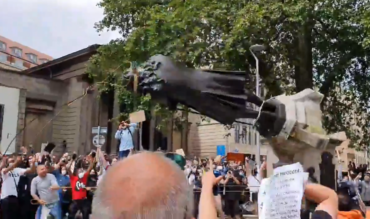 Video được đăng trên Twitter cho thấy những người biểu tình ăn mừng và nhảy múa xung quanh sau khi bức tượng rơi xuống mặt đất. Một người biểu tình đã được nhìn thấy quỳ cạnh bức tượng, bắt chước tư thế đầu gối đặt trên cổ của George Floyd - người đã chết sau khi bị cảnh sát ghì chặt hôm 25/5, châm ngòi cho các cuộc biểu tình trên toàn thế giới chống lại sự tàn bạo của cảnh sát.