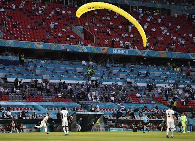 Một người biểu tình vì môi trường đã nhảy dù xuống sân vận động Allianz Arena (Đức) trước khi bắt đầu trận đấu bảng F giữa đội tuyển quốc gia Đức và Pháp.