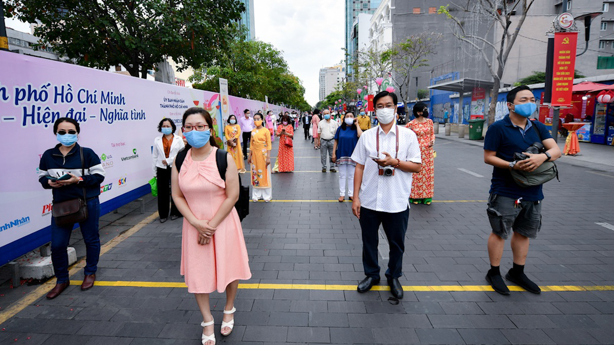 Video: Người dân đeo khẩu trang, xếp hàng vào tham quan đường hoa Nguyễn Huệ