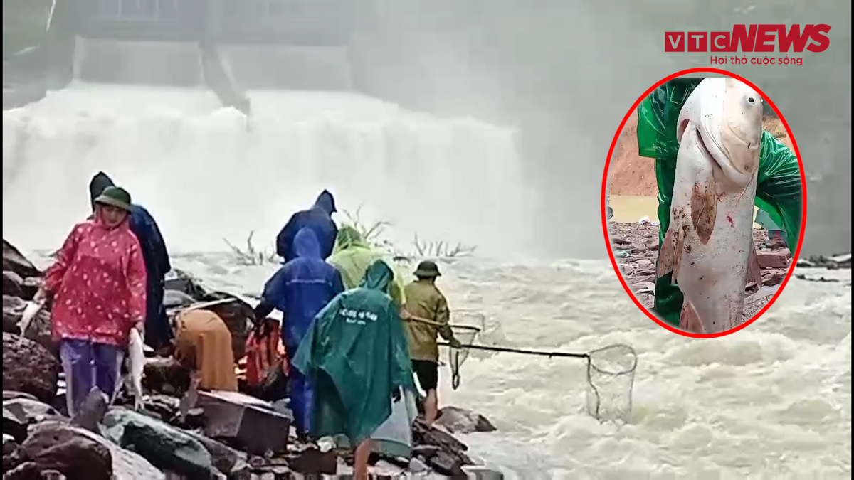 Bất chấp dòng nước cuồn cuộn đổ về lúc hồ Kẻ Gỗ, Hà Tĩnh xả tràn điều tiết lũ, nhiều người dân bất chấp nguy hiểm đánh bắt cá ngay dưới chân cửa xả.
