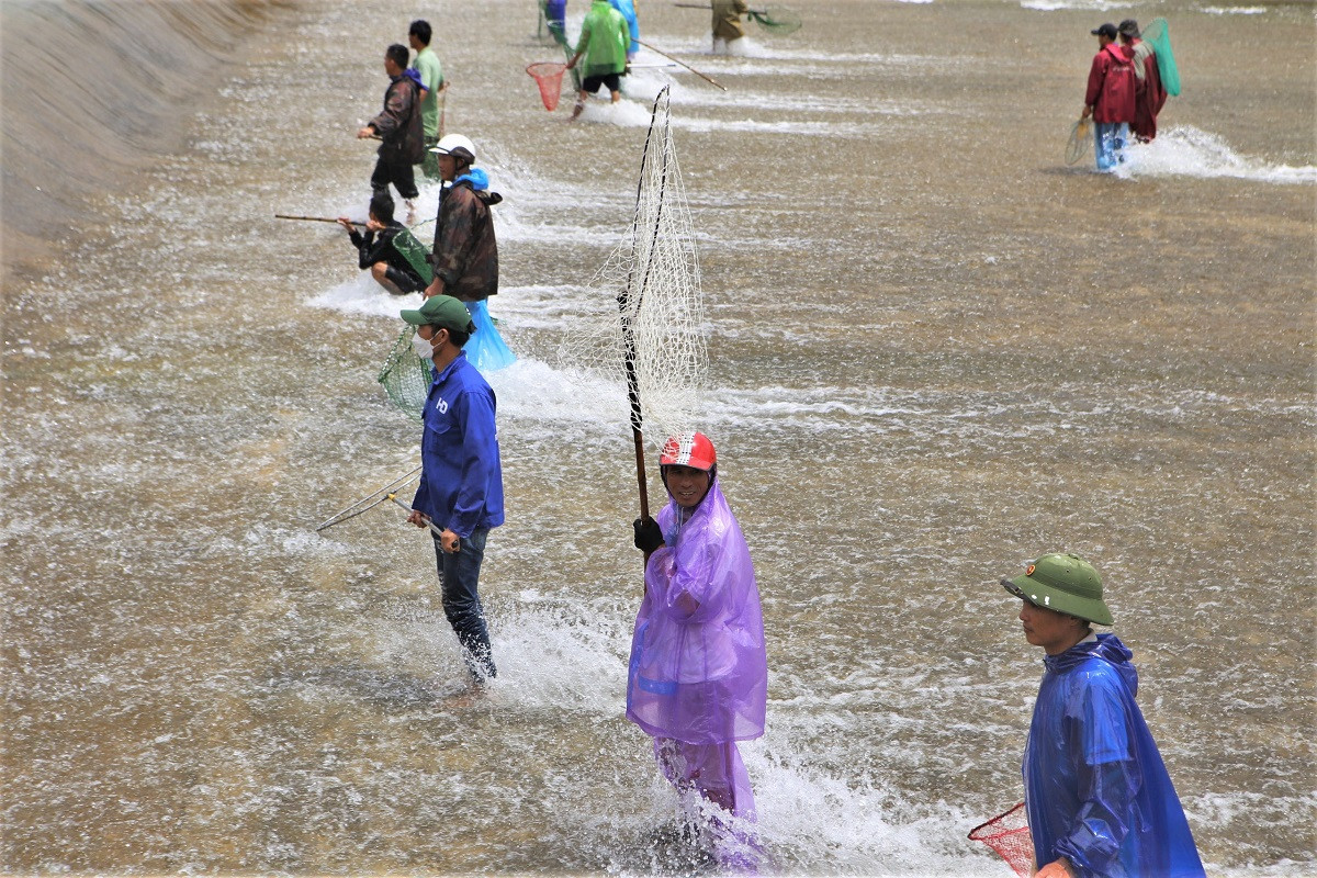 Bất chấp nguy hiểm, hàng chục người dân ở xã Thuần Thiện (Can Lộc, Hà Tĩnh) liều mình lao xuống đập tràn xả lũ để bắt cá.