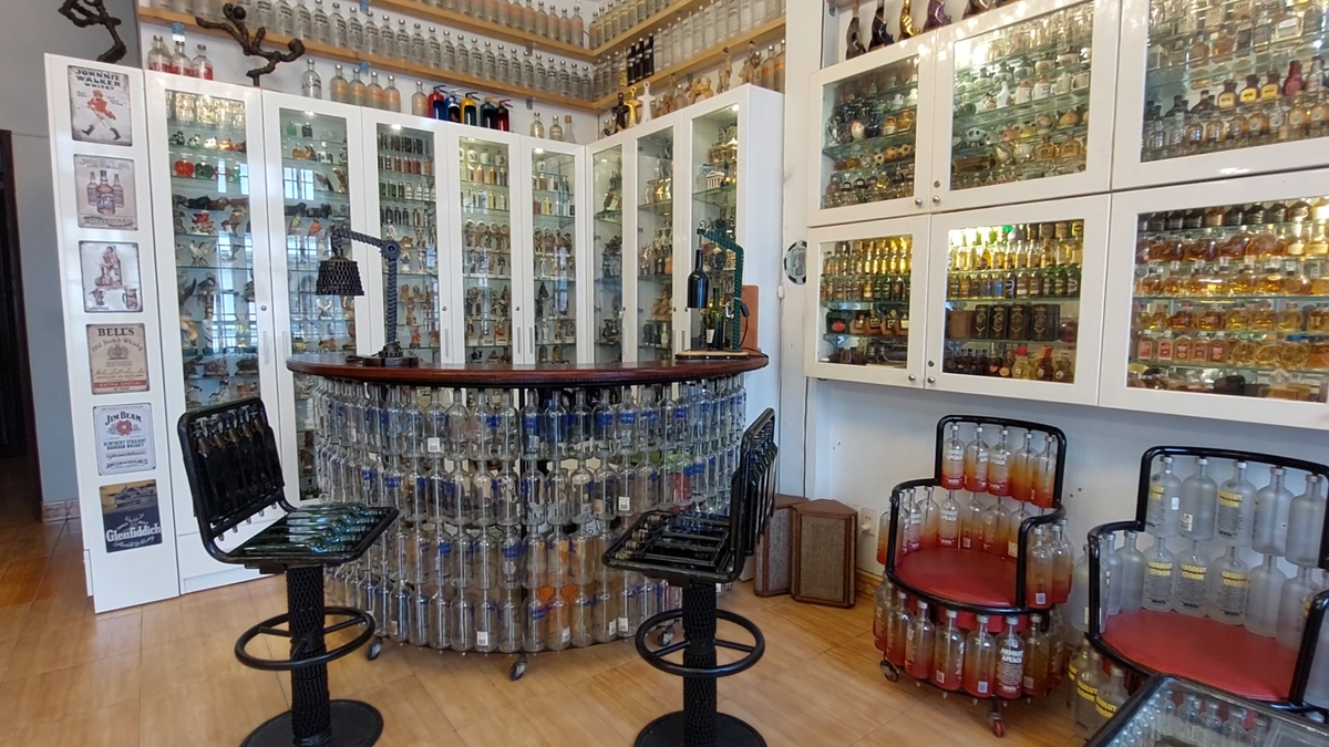 Hàng nghìn chai lọ bỏ đi được ông Đinh Nguyên Bình (Tân Phú, TP.HCM) chế tác thành đồ nội thất như: bộ bàn ghế, quầy bar, đèn trang trí…